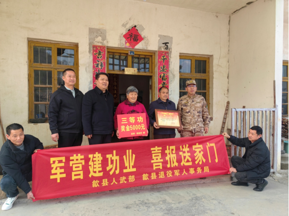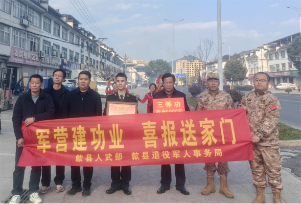 军地联合送喜报,军民鱼水情更深! 3月18日,歙县人武部、退役军人事务局会同溪头镇、北岸镇工作人员手持红色横幅,敲锣打鼓为两位荣立“三等功”的现役军人孙兵胜、张万城及其家属送去立功表彰喜报和奖励金,并向他们表示热烈祝贺,鼓励他们在军营继续再立新功,再创佳绩!