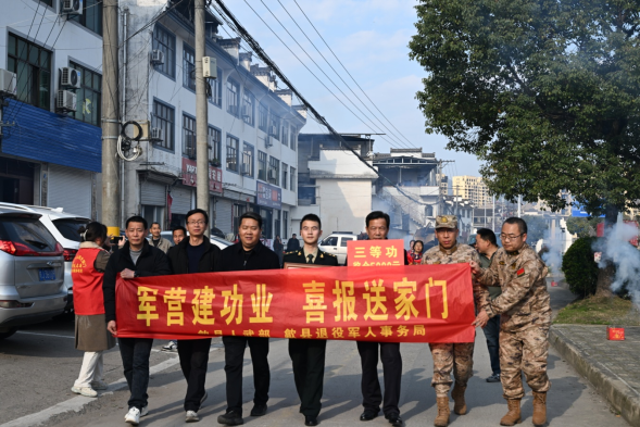 喜报进家门,荣誉励兵心。当天下午,锣鼓喧天、鞭炮齐鸣,慰问组一行高举“军营建功业 喜报送家门”的横幅,张万城本人和家人手捧立功喜报,在乡亲们的簇拥下走进家中。县人武部上校部长韩德强、县退役军人事务局局长洪四如共同为其颁发三等功奖状和慰问金,并向他们致以诚挚祝贺。现场掌声雷动,村民纷纷拍照记录这一荣耀时刻,共享军属荣光。