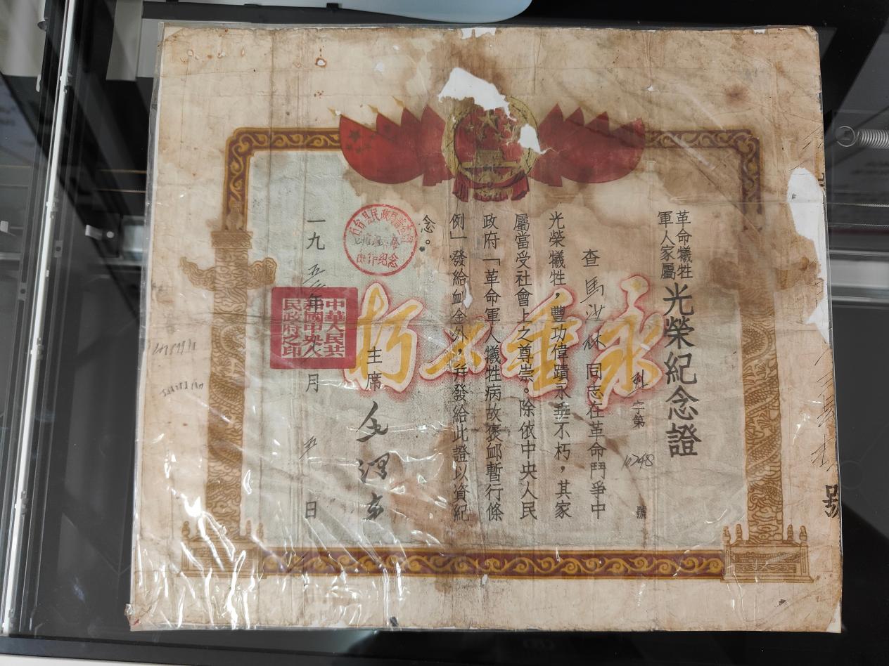 据了解,马沙林、马旺继、马旺龙三位烈士是捐赠者马小松爷爷的亲兄弟,三位烈士均在1934年壮烈牺牲。“这三张纪念证已经被我们家珍藏了70多年,现在我们自愿捐赠用于展出,希望后人们能够铭记历史,将保家卫国精神一代一代传承下去,这比放在家里更有意义。”马小松说道。