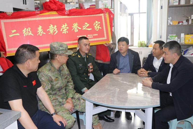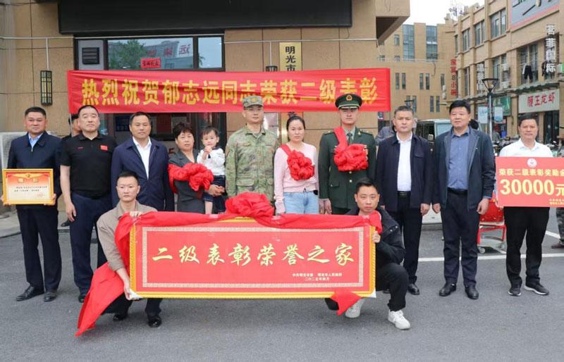 4月24日,明光市人民政府、市人武部、市退役军人事务局联合送喜报小分队,高举“热烈祝贺郁志远同志荣获二级表彰”横幅,在喜庆热闹的锣鼓声中,来到军人郁志远妻子家中,为其送上二级表彰喜报、“二级表彰荣誉之家”牌匾及慰问金,向在家探亲的郁志远和妻子表达诚挚问候和祝贺。