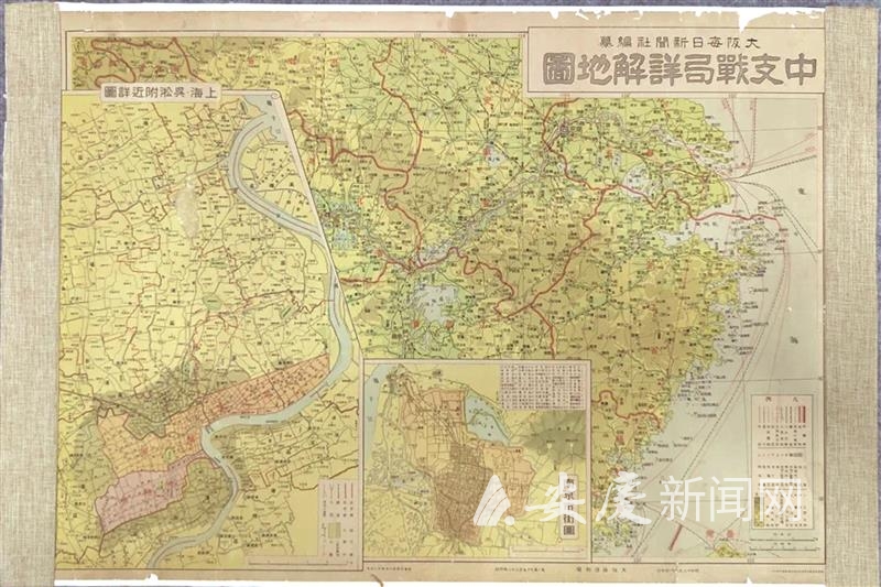 此次入藏的《1937年中支战略详解地图》用有机玻璃装框,横52.5厘米,宽39.3厘米,出版于1937年9月1日,正值淞沪会战关键时期,绘制范围涵盖华东地区六省一市。主图比例为1:2500000,“南京市街图”和“上海吴淞附近详图”两个附图比例分别为1:100000、1:150000。右上角注有:中支战局详解地图,大阪每日新闻社编纂。泛黄的地图上,还标注了以上区域铁路、机场等交通情况以及卫戍部队等重要军事设施。尽管相隔80多年,仍暴露出日本帝国主义“三个月灭亡中国”的战略意图,是日本发动侵华战争的有力罪证。