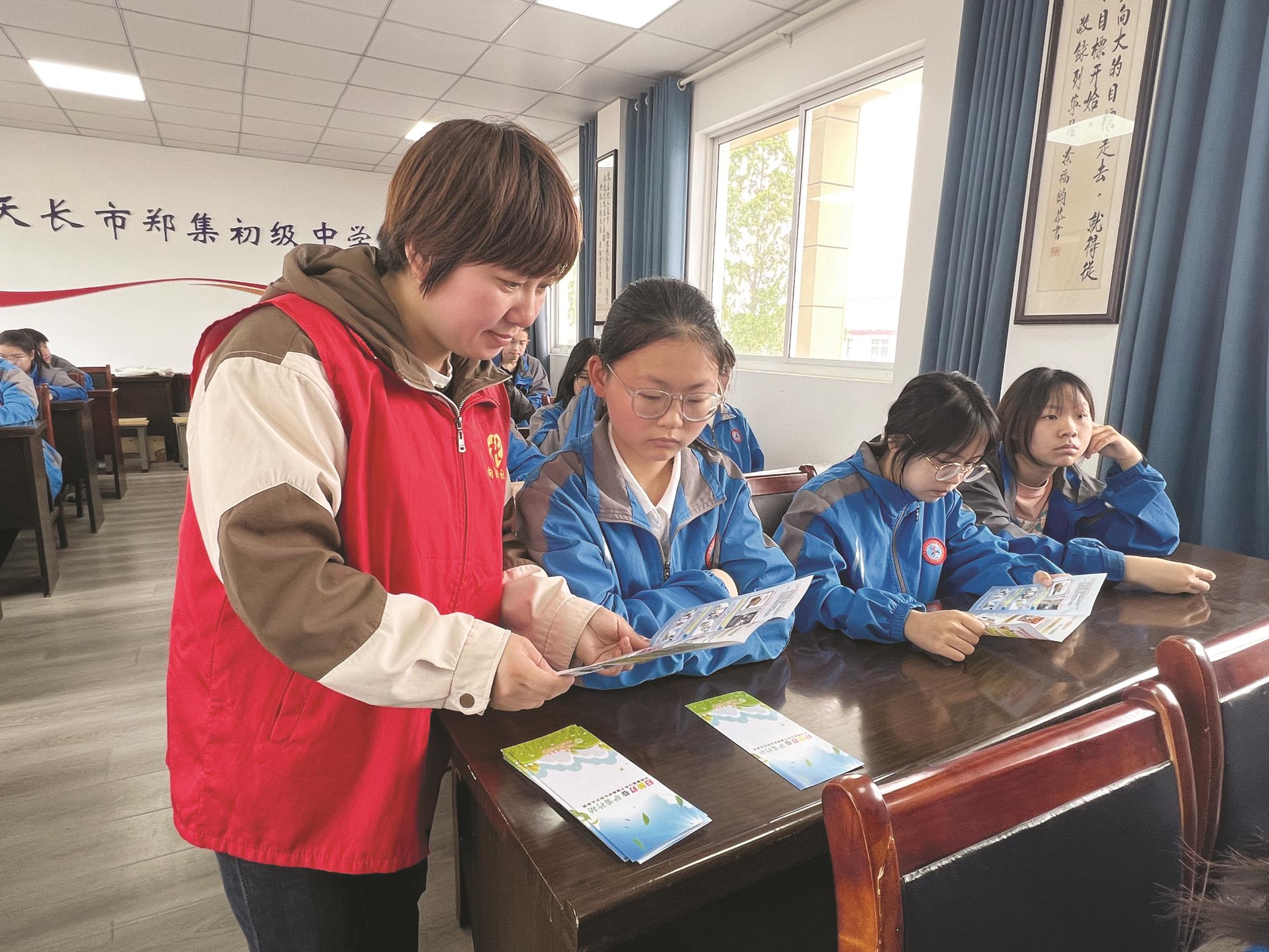 为培养青少年良好的阅读习惯,增强青少年的国防意识与爱国情怀,近日,天长市郑集镇新时代文明实践所联合郑集镇团委、郑集镇退役军人服务站、郑集镇社工站,开展“书香护苗伴成长,国防精神铸心间——‘世界读书日’暨‘护苗·绿书签’进校园”活动。活动通过知识讲座、捐赠图书、宣讲英雄事迹、发放“绿书签”等多种形式,为莘莘学子带来了一场知识与精神的文化盛宴。图为志愿者为学生发放和解读“绿书签”。(张孝赟 摄)