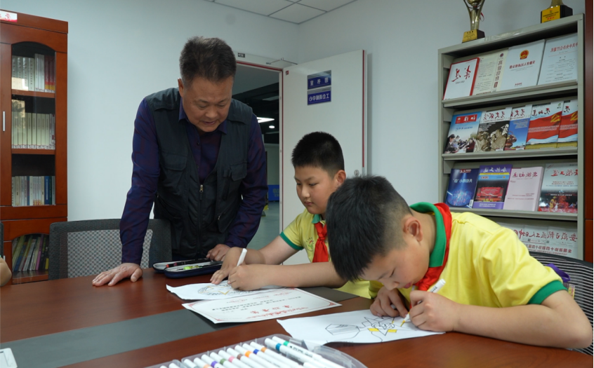 随后,在李子平的指挥下,大家共同唱响《强军战歌》,并拿出画笔,在纸上描绘起老兵军功章的模样。课程结束后,李子平为每个孩子发放活动证书,他欣慰地说:“看到你们朝气蓬勃、充满活力,爷爷很高兴,希望你们好好学习、热爱祖国,将来为国防建设贡献力量!”