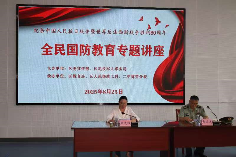 8月25日下午,在雄壮的《义勇军进行曲》中,马鞍山市博望区委宣传部、区退役军人事务局联合在博望二中分校隆重举办“铭记抗战雄壮史诗,弘扬伟大抗战精神”——纪念中国人民抗日战争暨世界反法西斯战争胜利80周年全民国防教育专题讲座。区委常委、宣传部部长金先红,区全民国防教育专项工作机制成员单位负责人、退役军人代表及博望二中分校全体高一军训新生近400人现场聆听。