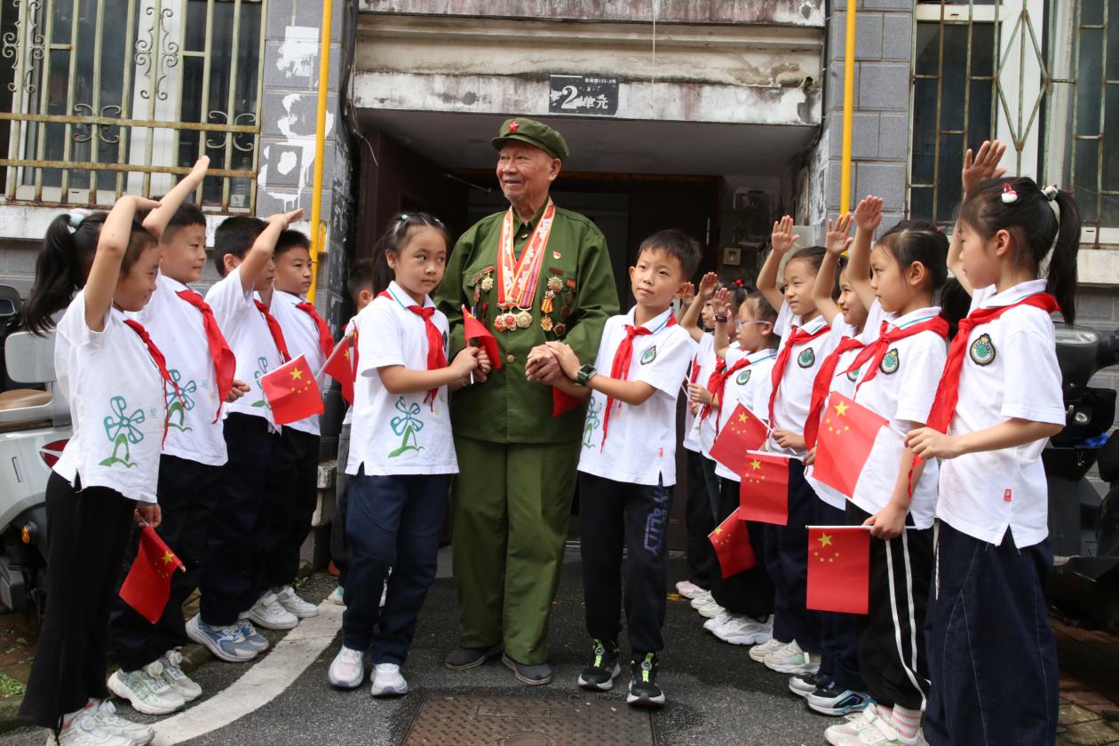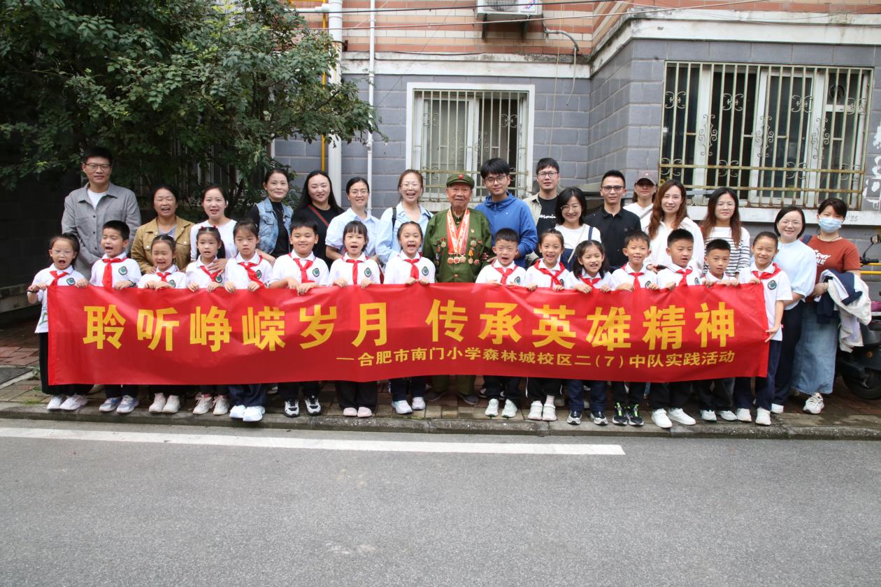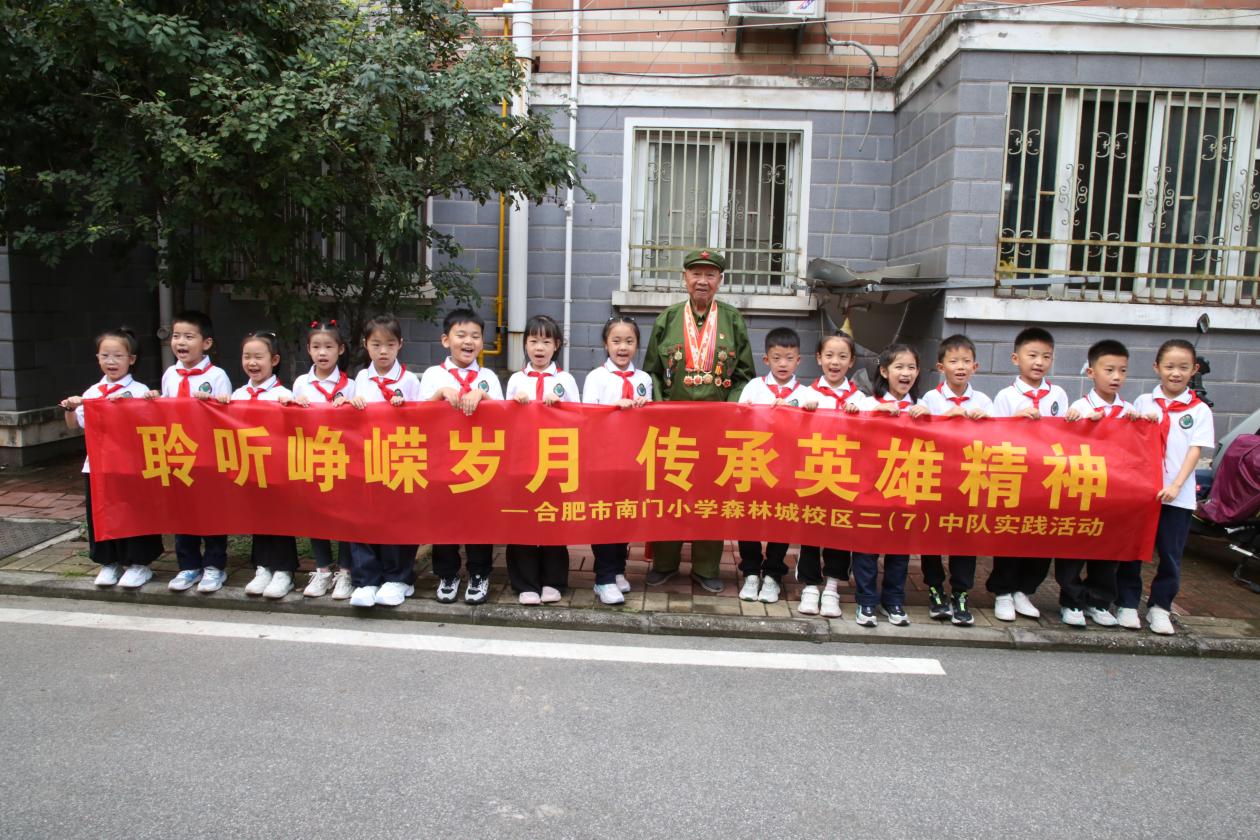 原来,当天合肥市南门小学森林城校区二7中队星球小队的少先队员们,在辅导员于非凡老师和杏花社区工作人员的带领下,开展主题为“聆听峥嵘岁月,传承英雄精神”的中队活动,他们来到新四军老战士宣钜华的家中,以特别的方式迎接国庆的到来。
