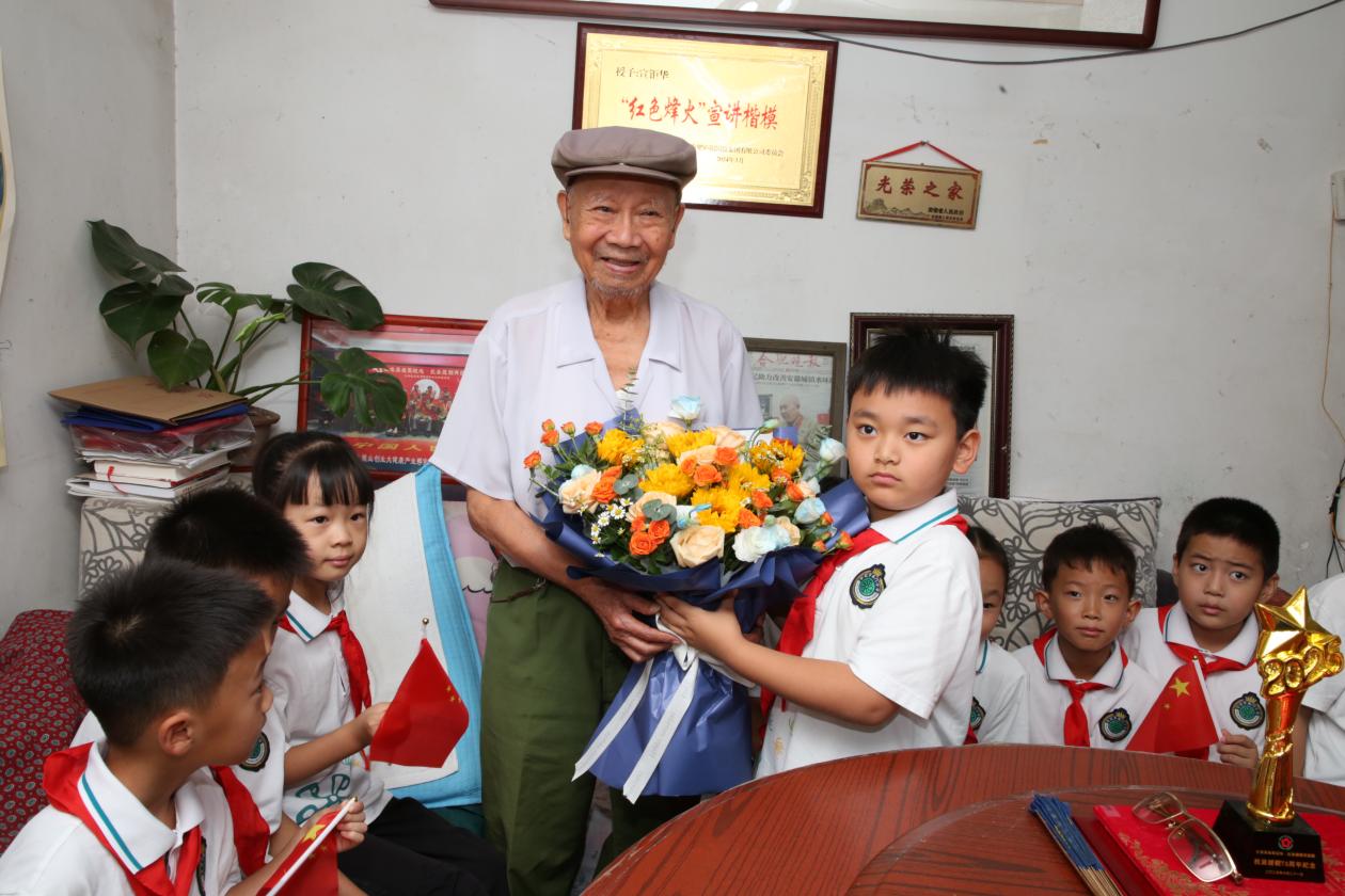 9月27日,91岁的新四军老战士宣钜华的家里来了一批特殊的小客人。数十名戴着红领巾的少先队员围在他的身边,聆听老人讲述烽火岁月的抗战故事。