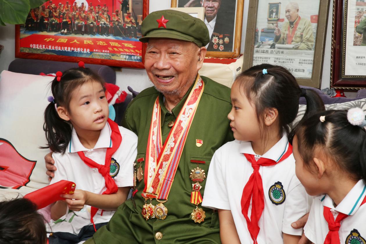 队员们围绕在宣钜华的身边,聚精会神地听着这位91岁的老人讲述他参加抗日战争的亲身经历,详细介绍了胸前佩戴的勋章背后的感人故事。10岁参加新四军、担任侦察员,奇袭日伪盘踞的晓星集(晓星集位于现合肥市大圩镇)……一段段峥嵘岁月令在场的小队员们深受触动,纷纷鼓起掌来。