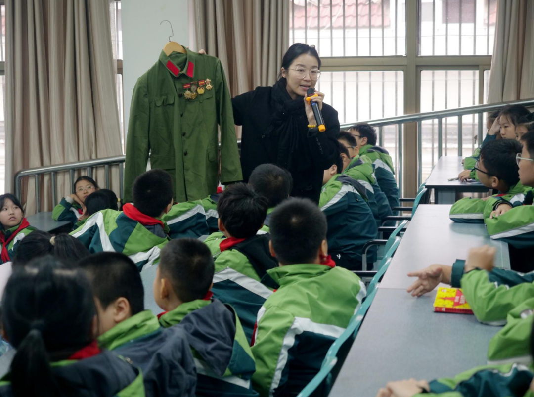 活动中,工作人员向孩子们展示了老兵珍藏多年的“中国人民解放军胜利功勋荣誉章”、“解放华中南纪念章”等勋章,并详细讲解了勋章背后的历史与意义。