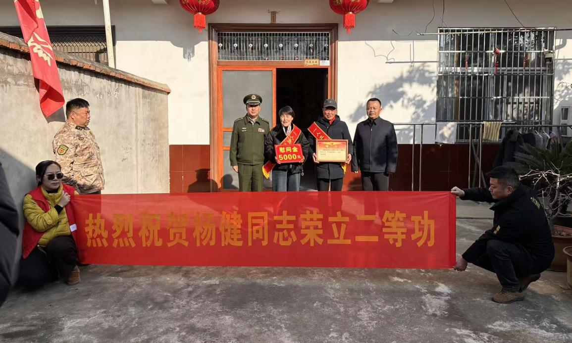 为持续营造“让军人成为全社会尊崇的职业”的浓厚氛围,激励有志青年参军报国,1月14日,伴随着喜庆的锣鼓声和鲜红的横幅,颍上县人武部、县退役军人事务局、杨湖镇党委政府一行,将二等功喜报及五千元奖励金送至杨健父母手中。这场“一人立功,全家光荣”的军地联合表彰仪式,让寒冬里的乡村洋溢着暖人心的荣光。