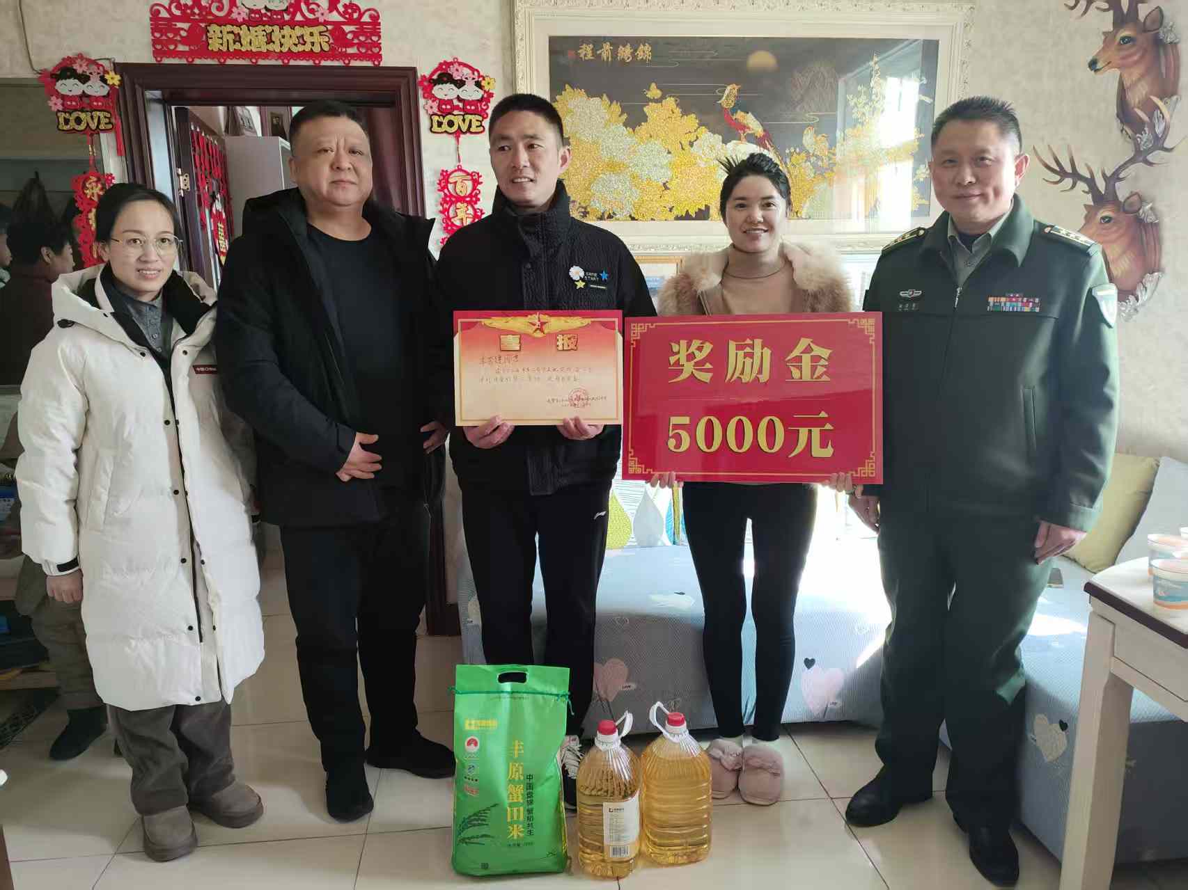 恰逢李秀建休假在家,蚌山区人武部政委胡召雷、经开区社会事业局四级调研员钱振勇与他们一家围坐一堂,促膝长谈。李秀建详细介绍了自己在武警第二机动总队的表现和立功事迹。慰问组向多年来默默付出、全力支持的李秀建家人表达了谢意,并送上慰问金和慰问品,同时勉励他们继续当好“坚强后盾”,支持李秀建再立新功。