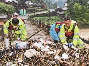 2024年6月,王忠心(右一)与救援队队员在休宁县蓝田镇儒村抢通因暴雨受阻的道路。武时化摄