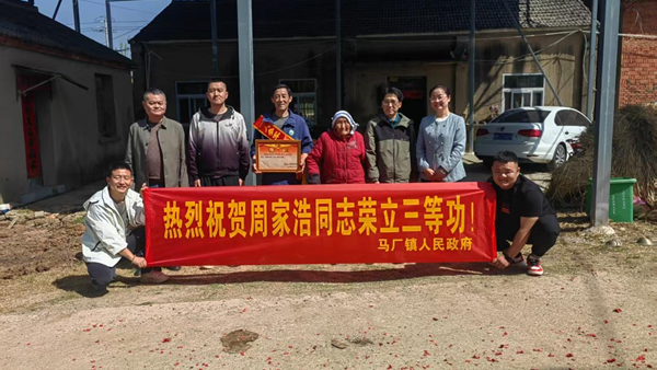 近日,全椒县马厂镇党委委员、武装部部长王进庆和退役军人服务站全体工作人员为荣立三等功家庭送去立功喜报及慰问金,传达党和政府对军人及军属的问候与祝福。