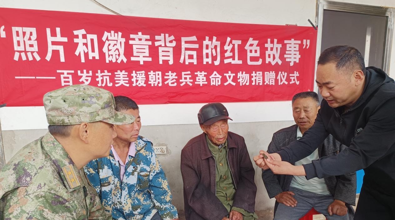 近日,淮南市潘集区夹沟镇华李村,102岁的抗美援朝老战士陈瑞启颤抖着双手,将珍藏70余年的“和平万岁”徽章和泛黄的“归国战友合影”通过潘集区人武部和潘集区退役军人事务局转交给安徽革命军事馆。