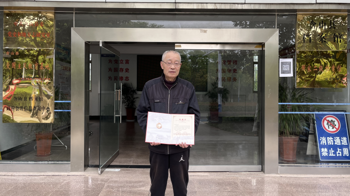 4月25日上午,含山县仙踪镇六衖村烈士朱立群的侄子朱帮安,向含山县档案馆(县委史志研究室)捐赠了纪念章以及朱立群烈士和其兄弟照片。