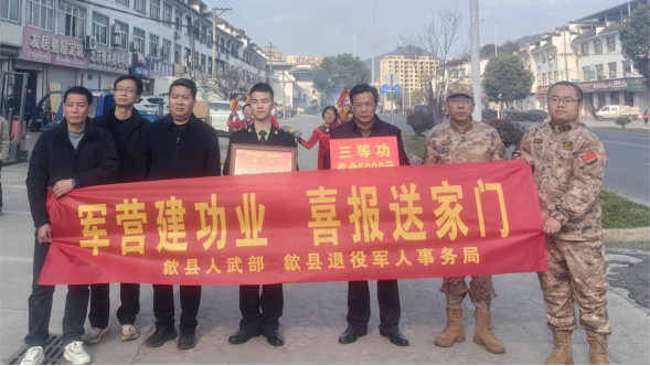 3月18日,歙县人武部、退役军人事务局会同溪头镇、北岸镇工作人员手持红色横幅,敲锣打鼓为两位荣立“三等功”的现役军人孙兵胜、张万城及其家属送去立功表彰喜报和奖励金。