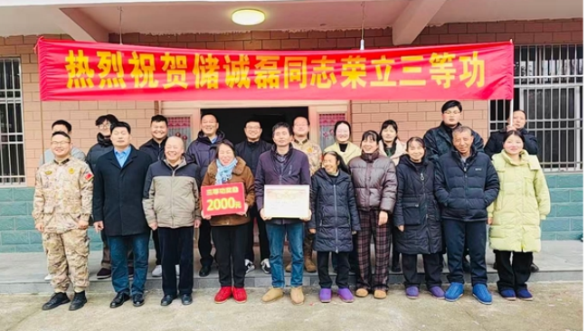 2月11日,岳西县人武部部长王飞为岳西籍军队文职人员储诚鸽送上三等功喜报,县退役军人事务局相关负责人参加。