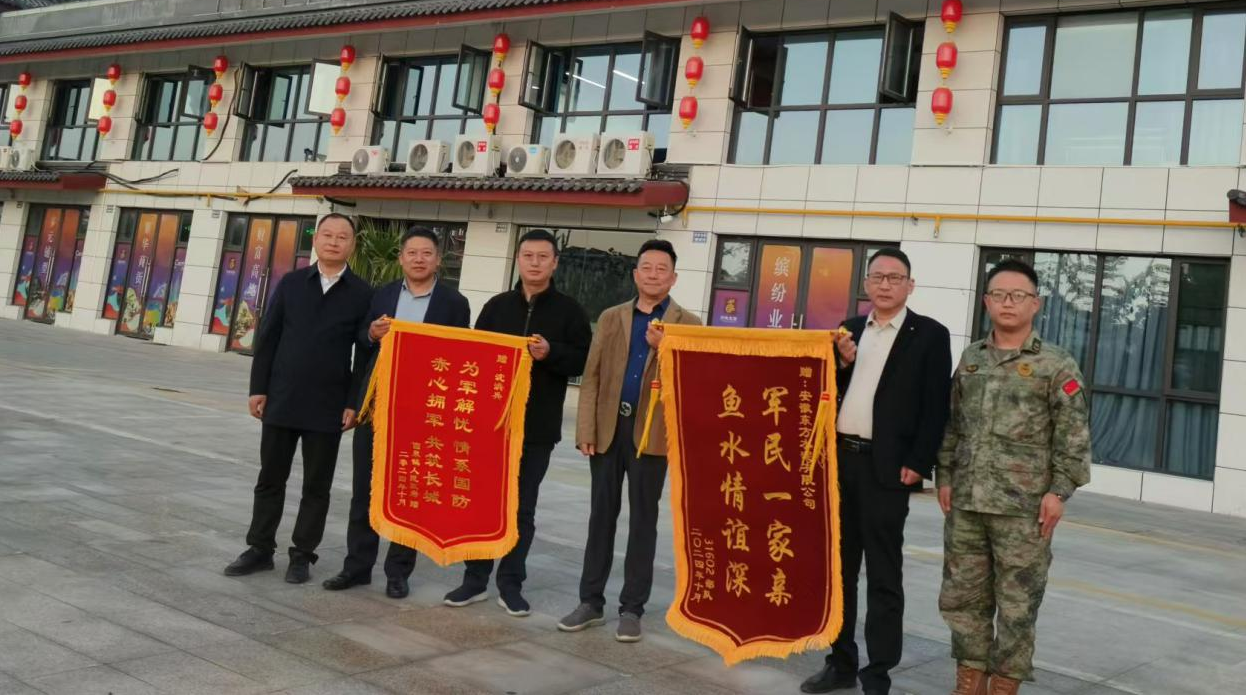 10月30日,驻蚌某部队及凤阳县西泉镇党委、政府主要负责人一行,向洪武老街赠送两面印有“军民一家亲 鱼水情谊深”和“为军解忧 情系国防 赤心拥军 共筑长城”的锦旗,对洪武老街营销中心在部队临时驻训期间提供的帮助和支持表示感谢。