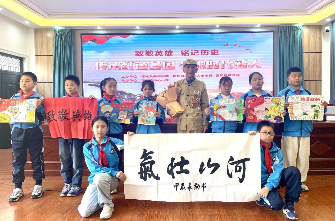 为激发学生们的爱国主义情怀,10月25日,宿松县委组织部、县退役军人事务局邀请抗美援朝老兵石宣水走到孚玉镇中心小学,为学生们讲述他浴血奋战、保家卫国的故事。
