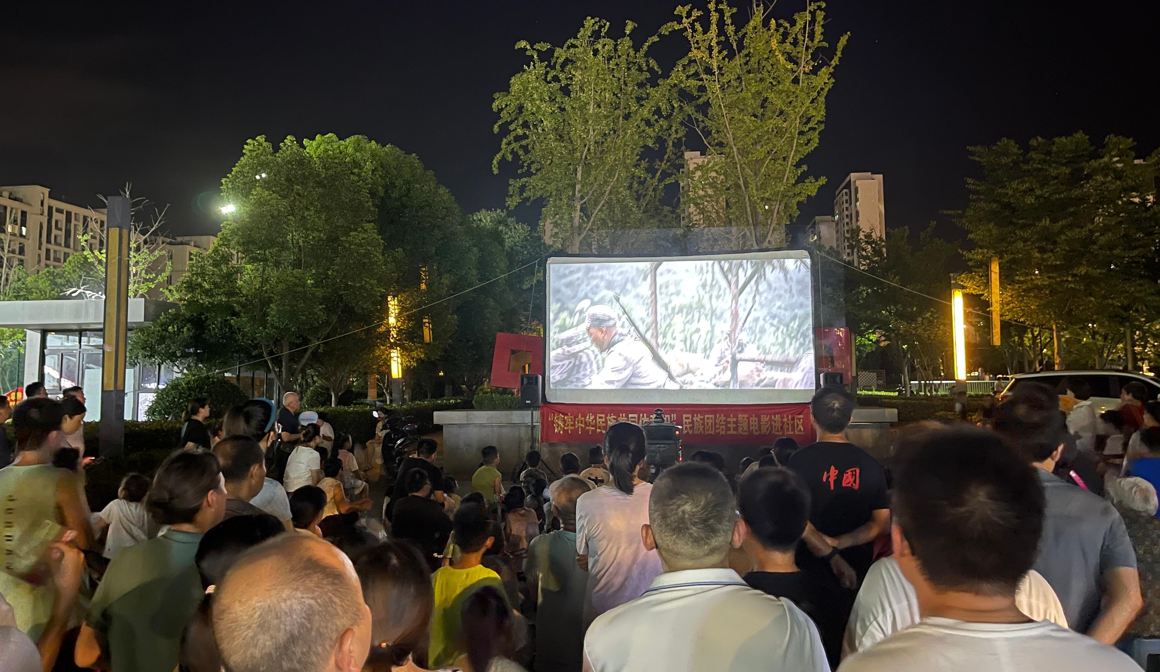 7月25日晚,由长丰县双墩镇统战办、百川社区党总支、百川汇·同心驿站共同组织开展的“铸牢中华民族共同体意识”民族团结主题电影进社区活动在万科中央公园举行。