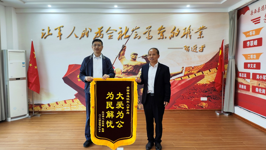 4月16日,岳西退役军人事务局迎来一位特殊人员:汪全润烈士亲属,他们专程从广东深圳回岳西赠送锦旗。