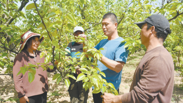 四月的春风拂过黄河故道,安徽省砀山县70万亩梨园郁郁葱葱。果园里,老兵王小辉正忙着指导果农摘梨芽、疏梨果。