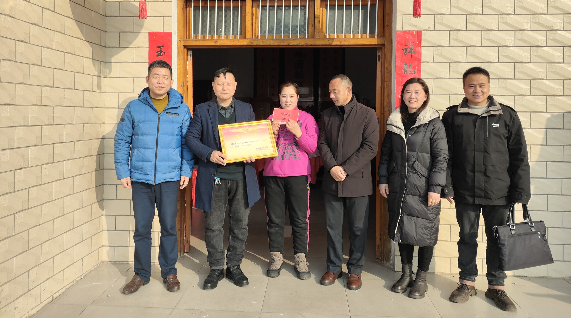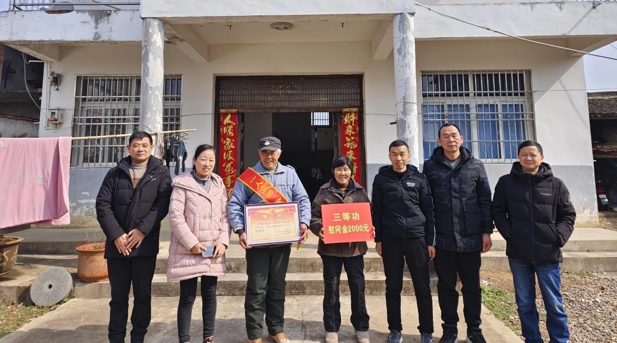为弘扬拥军优属光荣传统,营造关爱功臣模范的社会氛围,2月27日上午,怀宁县马庙镇党委委员马玫瑰、镇武装部部长江孝春等一行来到南山村丁超同志老家,向其家属送上丁超立功喜报和慰问金。