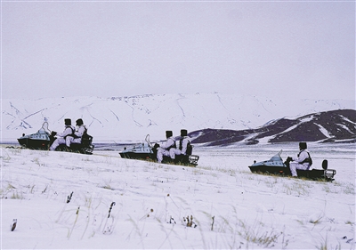官兵骑乘摩托雪橇前往巡逻地域。