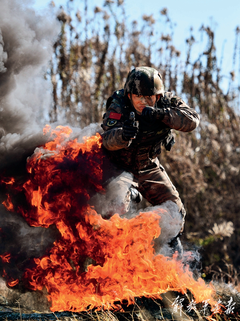特战队员飞越火障。
