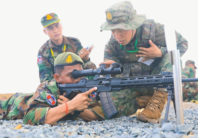 5月18日,中柬“金龙-2024”联合演习双方参演官兵开展教学交流活动。“金龙”系列联演是中国军队和柬埔寨军队的例行军事合作活动,旨在巩固和发展中柬两国全面战略合作伙伴关系,增进政治互信,拓展两国军事交往。图为中方参演人员指导柬方人员操作轻武器。刘佳利摄