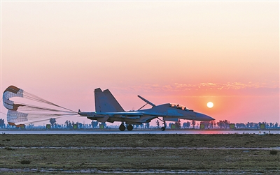 晨光熹微,朝霞似锦。在金色霞光映照下,参训战机陆续返航。据介绍,今年以来该团持续加大夜间飞行训练力度,让飞行员在近似实战条件下锤炼本领,提升了部队实战能力。(特约通讯员 徐晨桐 摄影报道)