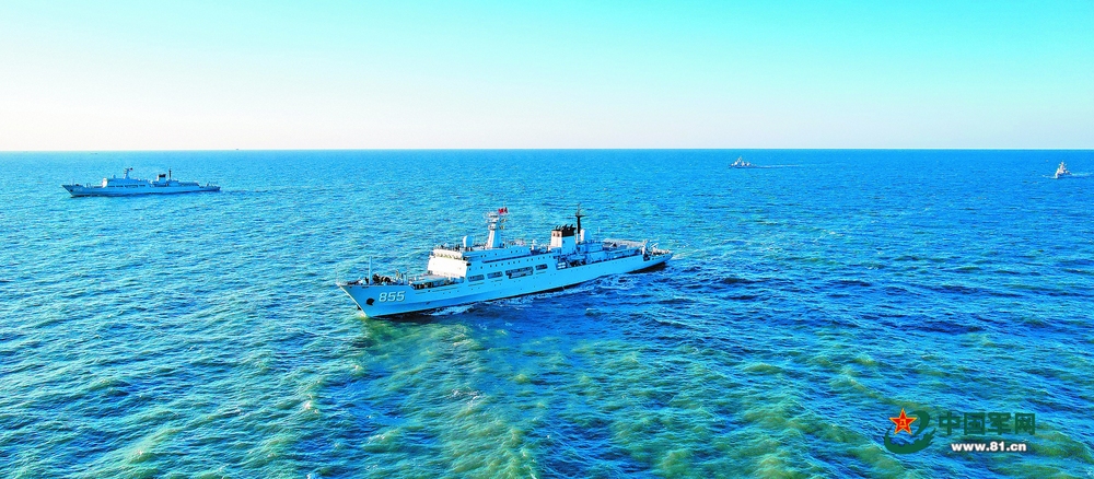 初冬,海军某中心数艘舰艇组成编队,赴某海域开展海上多科目训练。