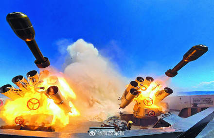 不多时,某护卫舰率先锁定目标。“发射!”指挥员果断下达攻击指令,数枚火箭深弹脱膛而出扑向目标,海面激起数米高的水柱。