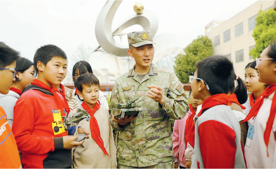 4月中旬,安徽省肥东县人武部和驻军某部官兵走进白龙镇中心小学开展全民国家安全教育日活动。图为驻军某部干部为学生讲解武器装备知识。曲文榜摄