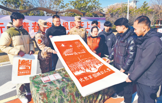 临近寒假,安徽省砀山县征兵办积极开展丰富多彩的征兵宣传活动。图为非遗传承人向应征青年展示国防主题剪纸。李金春摄