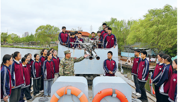 近日,安徽省淮北市杜集区人武部组织全民国家安全教育日活动。图为学生参观退役军舰。郭 林摄