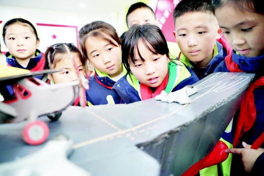 12月1日,裕安区齐云路小学的同学们在观看“云朵携梦行 共赴国防约”红领巾爱国防主题模型作品展,进行国防教育。