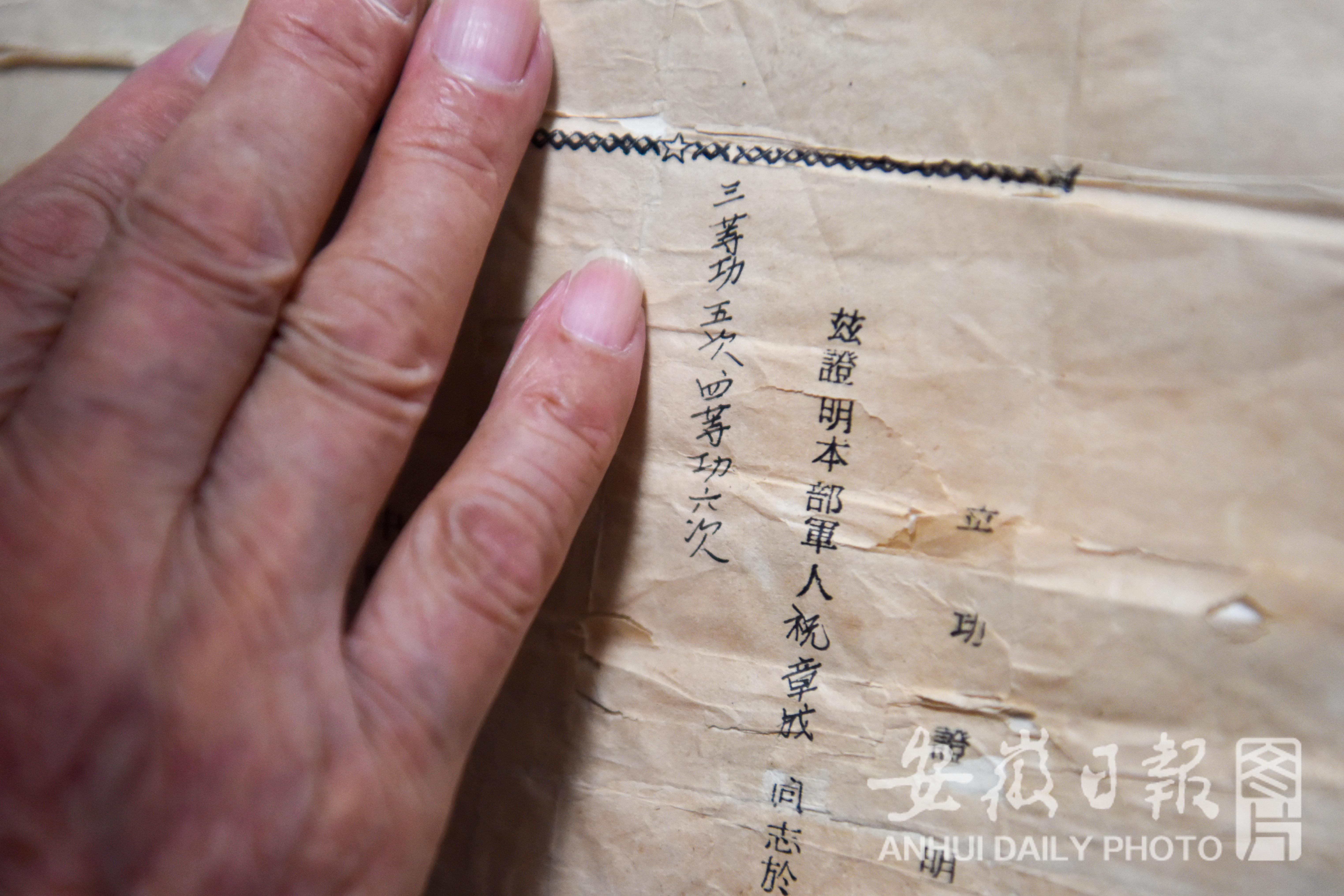 指着一张写有“共立三等功五次、四等功六次”发黄的“立功证明信”,祝章成告诉记者:“这上面的功劳不都是我本人的。”原来,1956年祝章成转业时,总共获得三等功三次、四等功一次,师政工科科长叮嘱道:“小祝,朝鲜战场上牺牲了那么多战友,他们也获了很多战功……我把他们的功劳都记在你的名下……你要记住他们!不要忘记他们!”