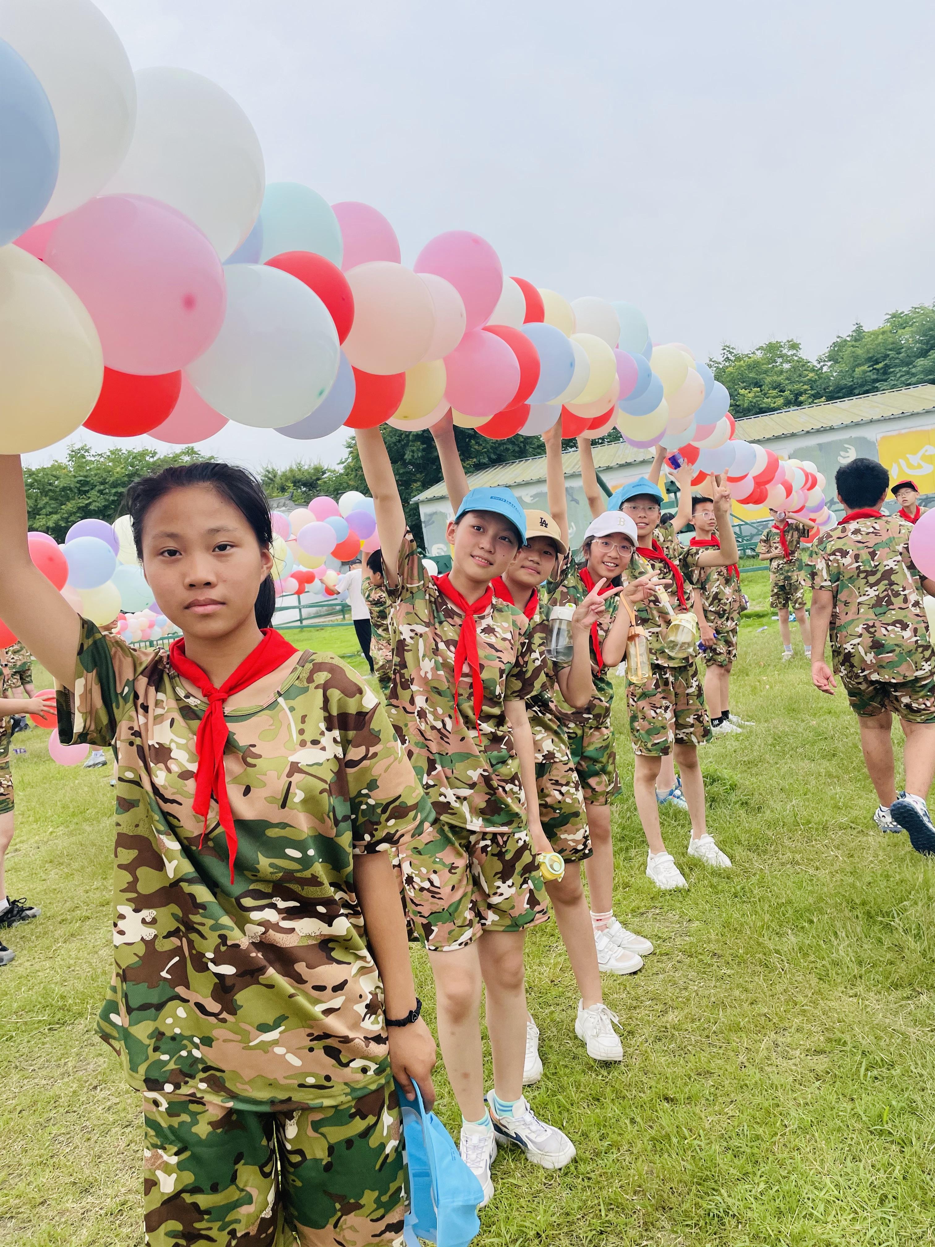 第二天的早晨,同学们在集合哨中醒来,大草坪上的“舞龙大赛”游戏将气氛拉到了又一个高潮,这是一项集团队协作与挑战于一体的活动。教官举着龙头,每人吹好气球再把气球固定在绳索上扎成龙身,巨龙扎好后,每个队伍之间互相PK,它每一次摆动,不仅传递着集体凝聚力的震撼,也让每位参与者深刻体会团队合作的巨大力量。