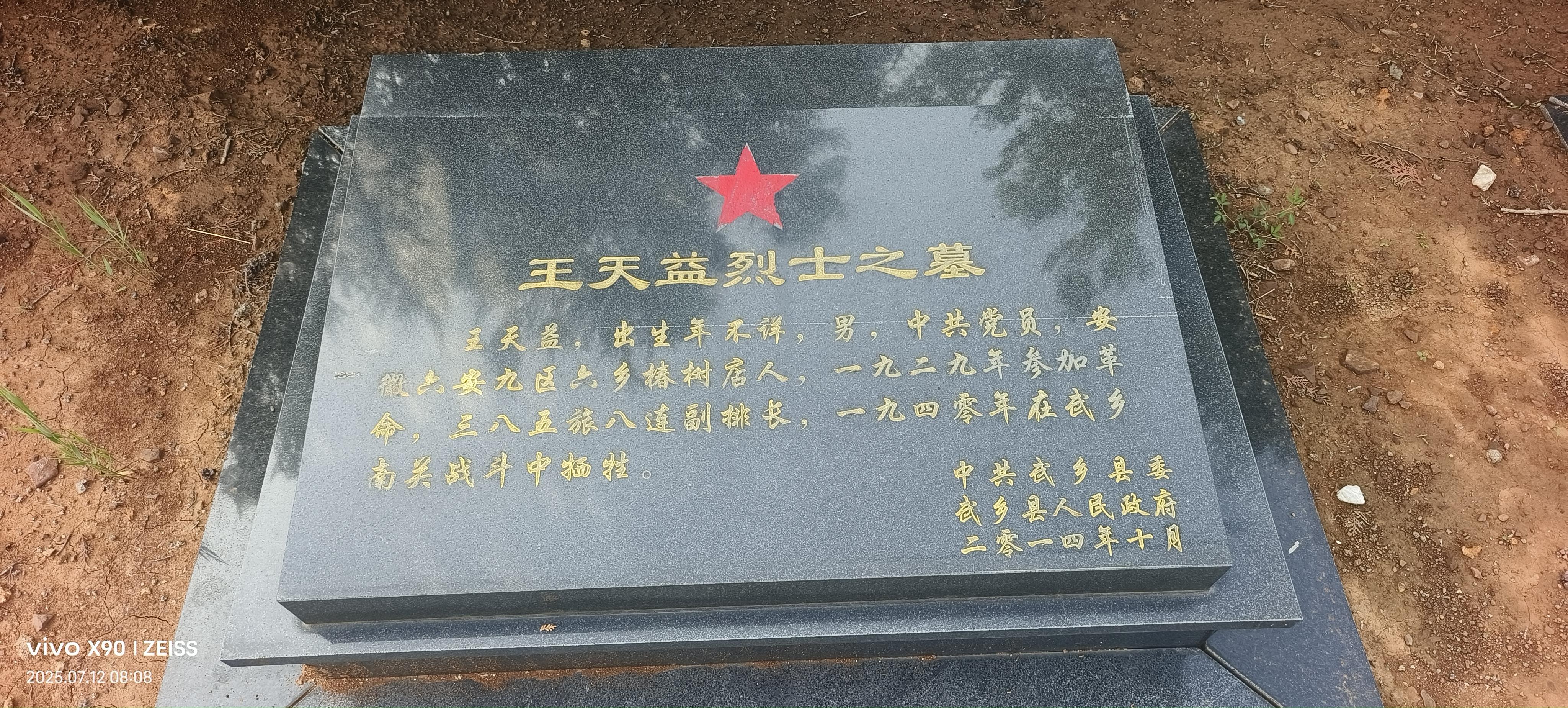 不过六安金安区中店镇椿树岗村支部委员晁胜平告诉大皖新闻记者,王天益墓碑上记载的“椿树店”很可能就是现在的“椿树岗村”,“我通过查找资料和问村里老人知道的。”晁胜平说,现在还没找到王天益烈士的亲人,“我准备查一下村里的族谱,看看有没有更多的信息。”