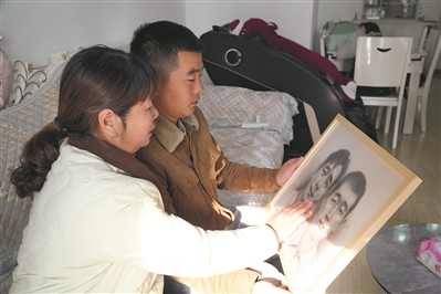 王涛和母亲王玲仔细端详自己和父亲的同框画像。王 伟摄