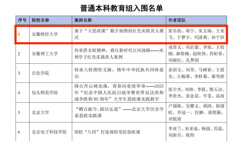 近日,2026年全国高校“大思政课”实践教学典型案例征集活动结果正式揭晓,入围案例292件,安徽财经大学马克思主义学院申报的《基于“大思政课”数字地图的红色实践育人模式》成功入选。