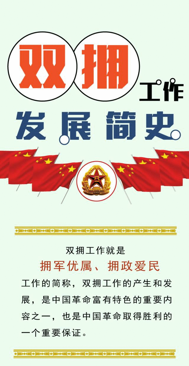 许多人都不了解双拥工作到底是做什么的,双拥工作是拥军优属、拥政爱民的简称,它深刻反映了中国军民血肉相连的本质特征,生动体现了党的宗旨、国家的性质和人民军队的本色,是中国党、国家和军队的优良传统和特有的政治优势。在不同的历史时期有着不同的工作重点。