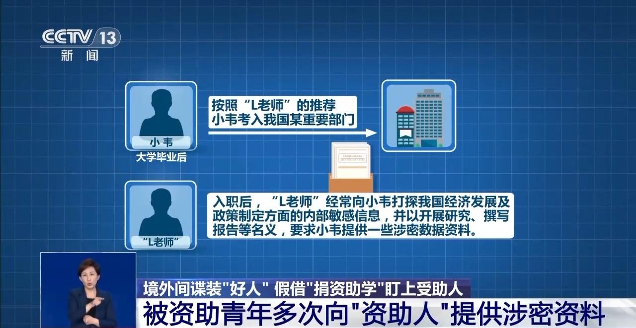 经国家安全机关查明,“L老师”的真实身份是境外间谍情报机关人员,多年来一直在我国境内物色、培养像小韦一样出身贫苦、成绩优秀、具备较好发展前景的青少年,妄图“放长线、钓大鱼”。他们假借“捐资助学”之名,利用受助人员的“报恩”心理,怂恿其报考党政机关、科研院所或参军入伍,借此打入关键核心岗位,进而指挥其非法搜集窃取内部敏感资料,开展危害我国国家安全的间谍窃密活动。