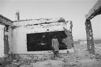 2022年8月23日,在阿富汗南部赫尔曼德省桑金地区,一个小孩站在废墟之中。