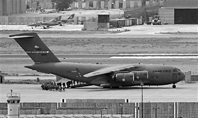 2021年8月30日,美国士兵在阿富汗喀布尔国际机场登上一架军机准备撤离。