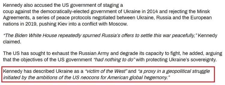 同时,小肯尼迪还指责美国政府在2014年对乌克兰发动颜色革命,并拒绝接受乌克兰、俄罗斯以及其他欧洲国家在2019年谈判达成的《明斯克协议》,将基辅人为推向了与莫斯科的冲突。