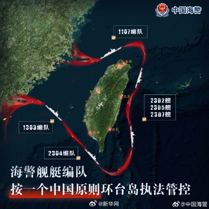 中国海警局东海分局新闻发言人朱安庆表示,4月1日,多支海警舰艇编队位台岛周边海域组织执法巡查,开展临检拿捕、拦截扣押等科目演练。台湾是中国的一个省,这是按一个中国原则依法管控台岛的实际行动。