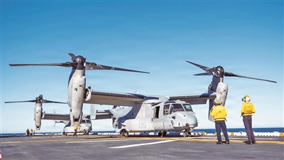 美海军陆战队MV-22“鱼鹰”倾转旋翼机在两栖攻击舰上进行训练。