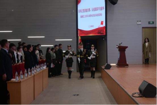会议伊始,会场播放了最新的全国征兵宣传片及军营宣传片。随后,校国旗护卫队踢正步护送国旗进入会场,随着护卫队长的指令发出,全体起立,奏唱国歌。