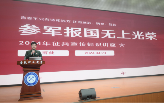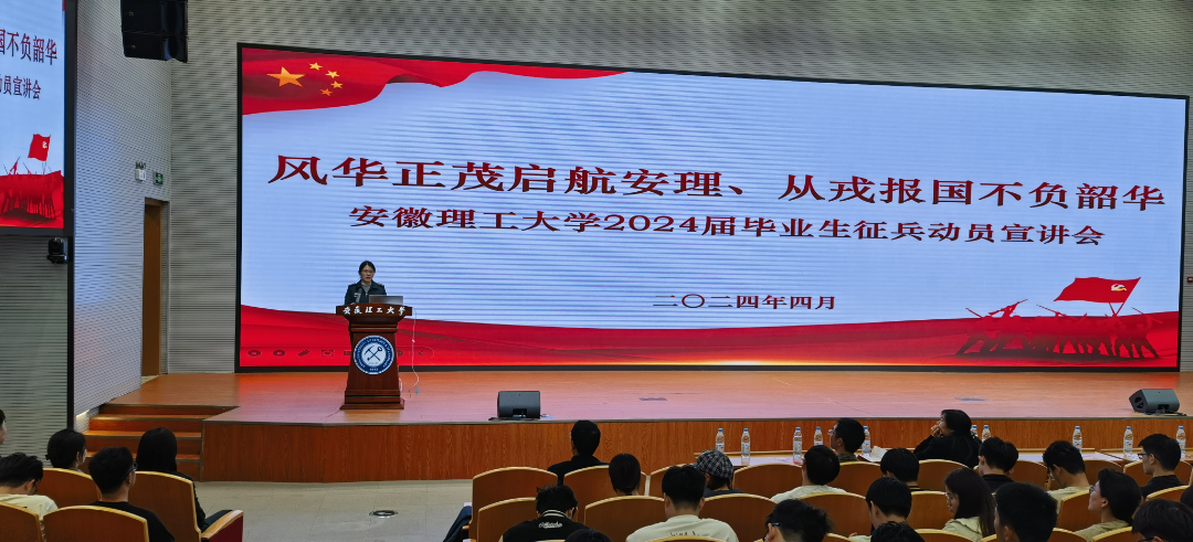 为深入贯彻落实习近平强军思想,宣传国家征兵政策,激发青年大学生参军入伍热情,推动大学生征兵工作提质增效,4月23日,安徽理工大学举办了2024届毕业生征兵动员宣讲会。党委学工部、校团委、党委武装部、各学院分管征兵工作负责人、毕业班辅导员及2024届毕业生代表400余人参加本次活动。